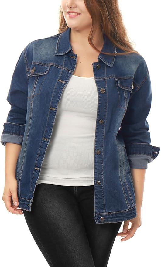 Women's Plus Size Jean Jacket Stitching Button Front Washed Denim Jacket